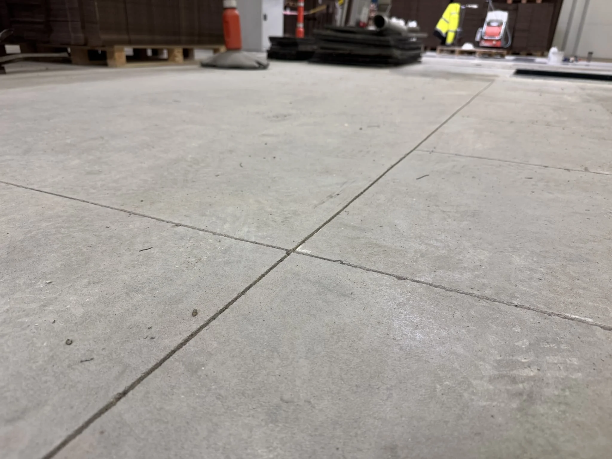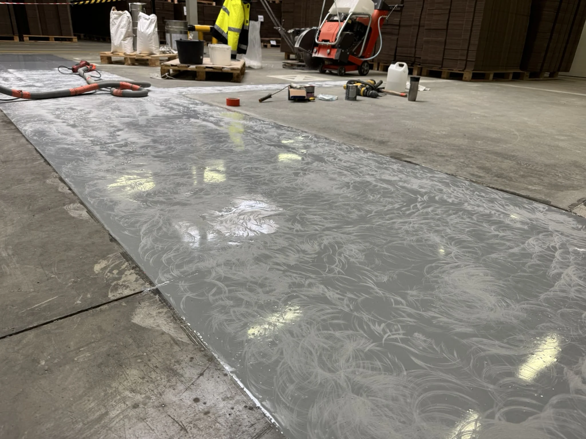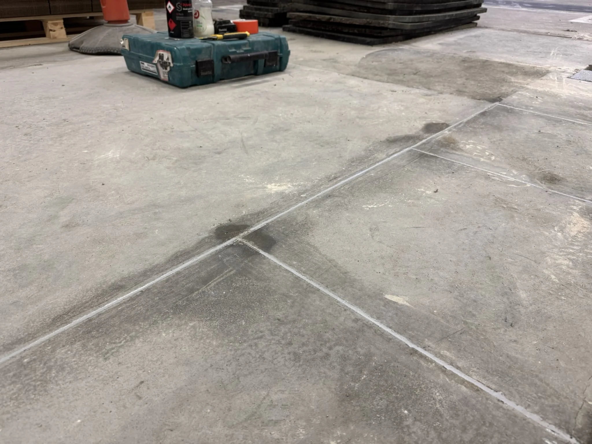 The cracks. First, we slightly widened and cleaned them to ensure the resin penetrated properly. Then, we filled them with resin and sprinkled the surface with fine quartz sand, making the repaired area non-slip. Once it had set, we removed the excess sand and leveled the surface of the industrial floor repairs.