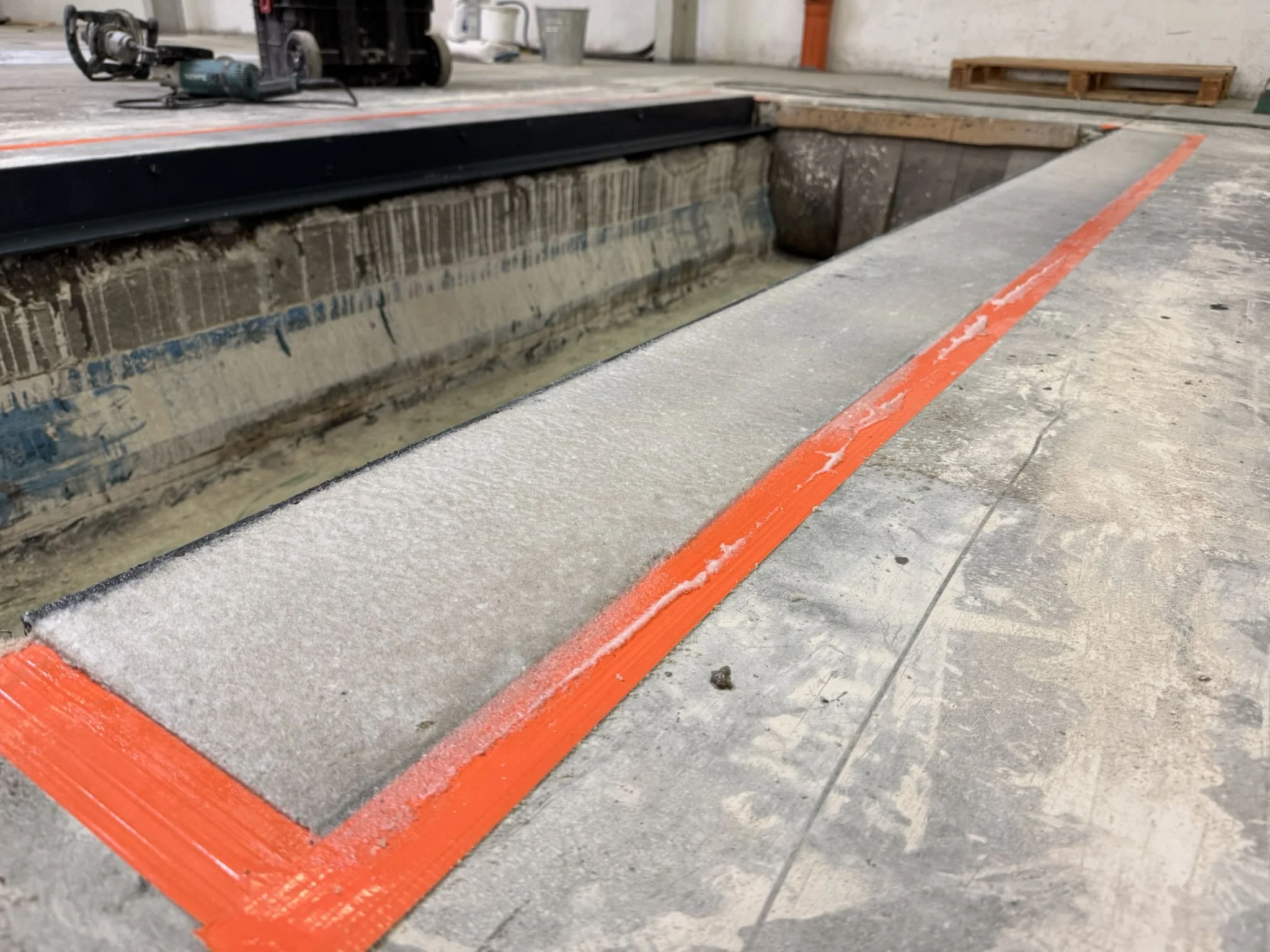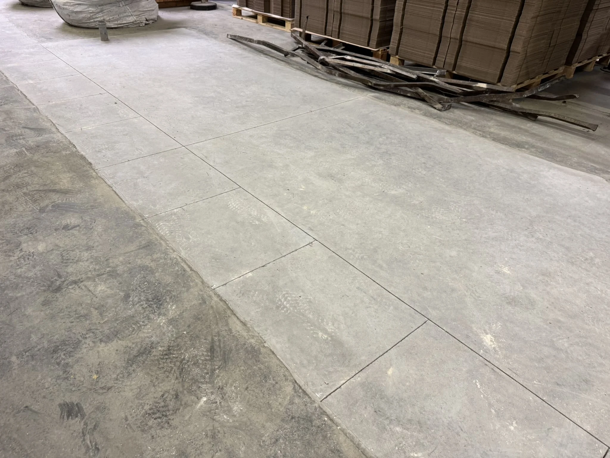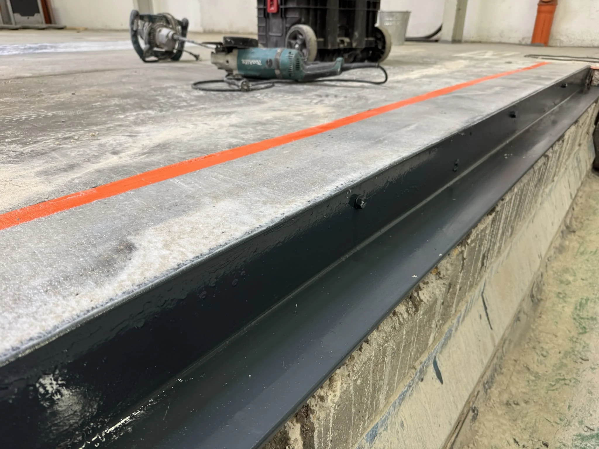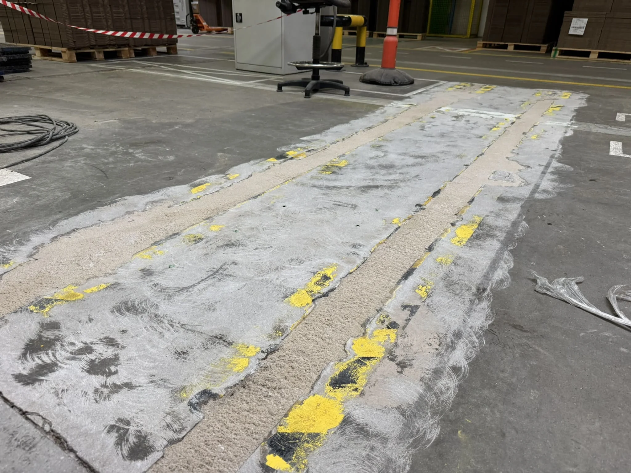 The cracks. First, we slightly widened and cleaned them to ensure the resin penetrated properly. Then, we filled them with resin and sprinkled the surface with fine quartz sand, making the repaired area non-slip. Once it had set, we removed the excess sand and leveled the surface of the industrial floor repairs.