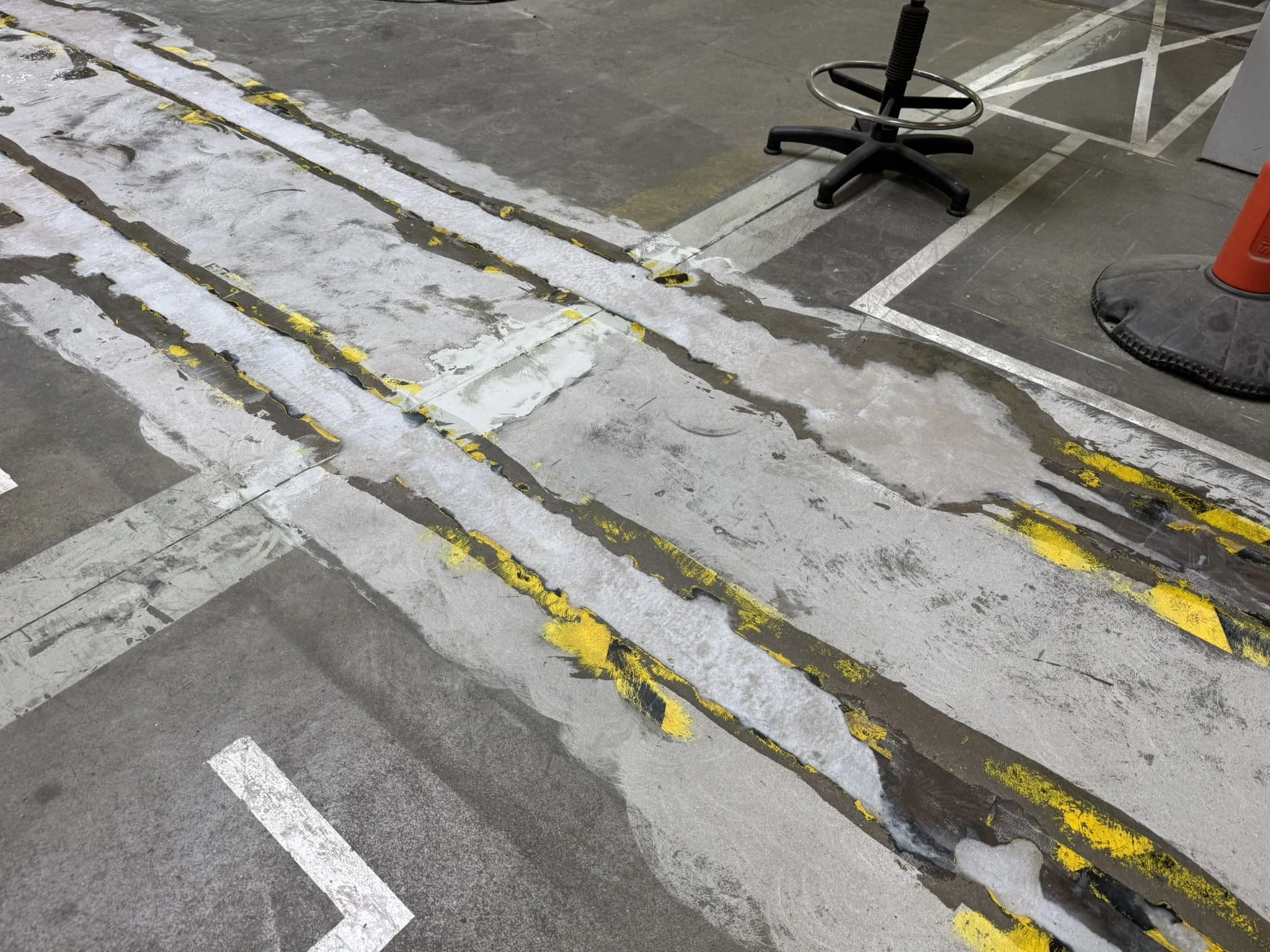 Before we began, we marked off the work zones with tape and barriers, installed signage, and organized alternate transportation. We coordinated a schedule with production management to conduct the noisier and more disruptive work during off-peak hours. We also provided ventilation and dust extraction equipment, as cutting and grinding concrete floors generate a significant amount of debris.